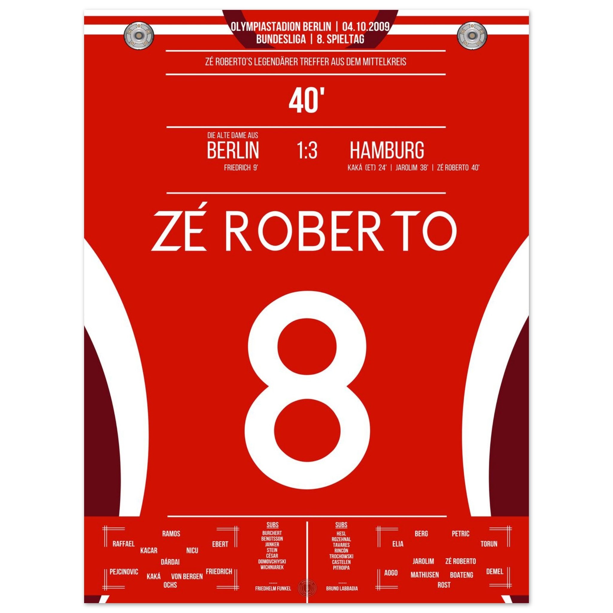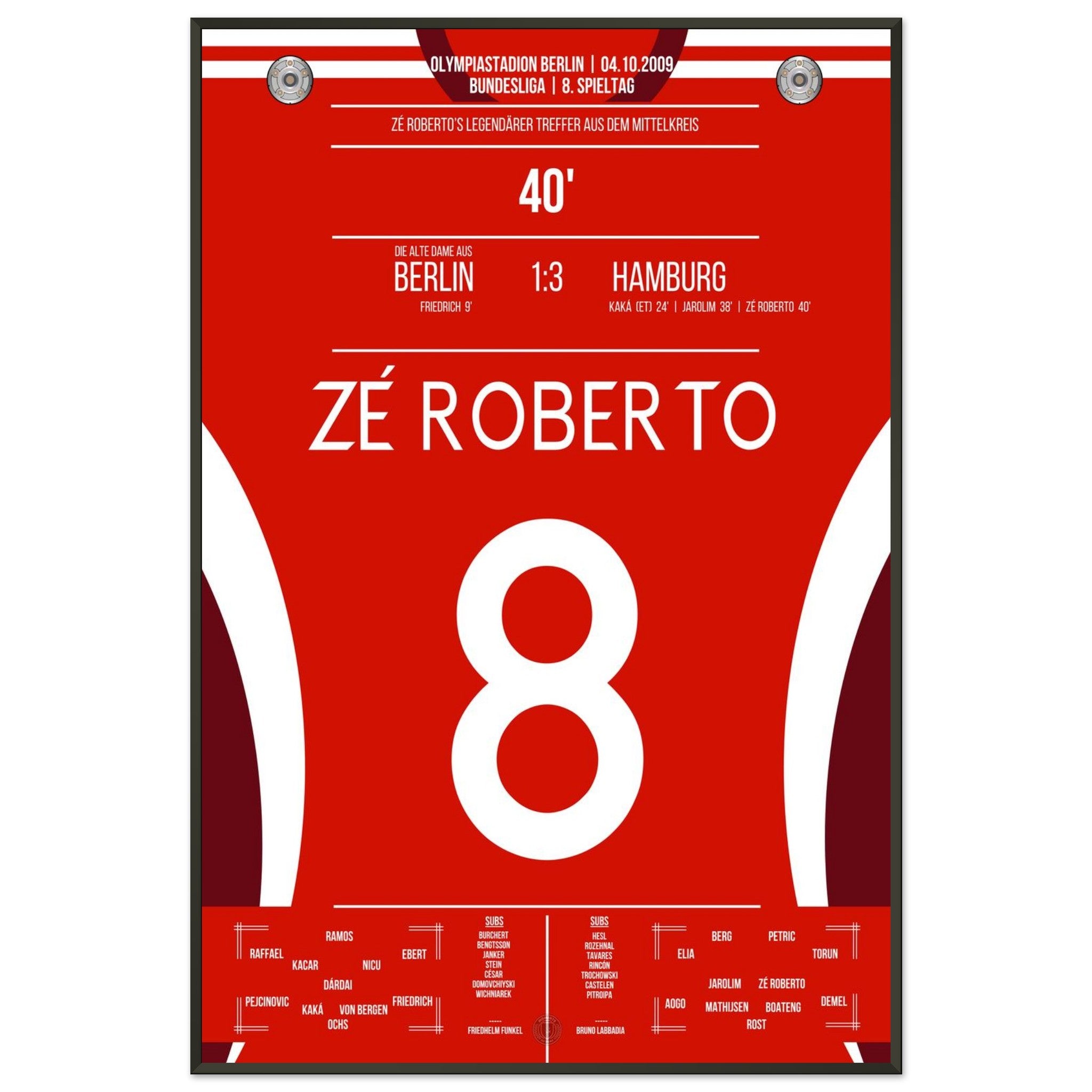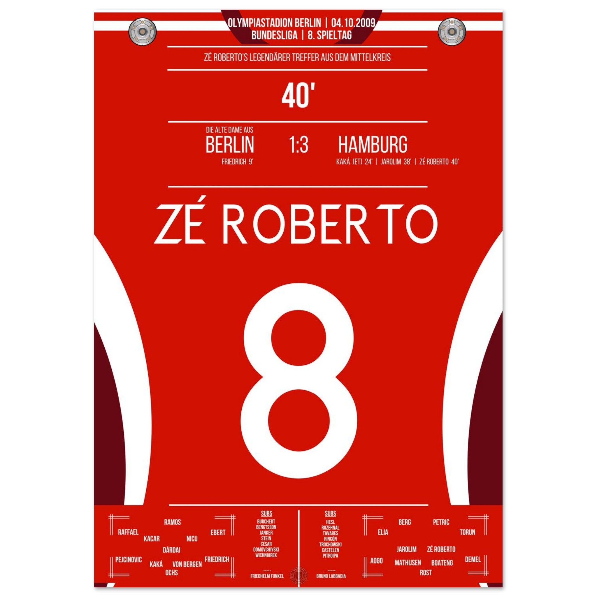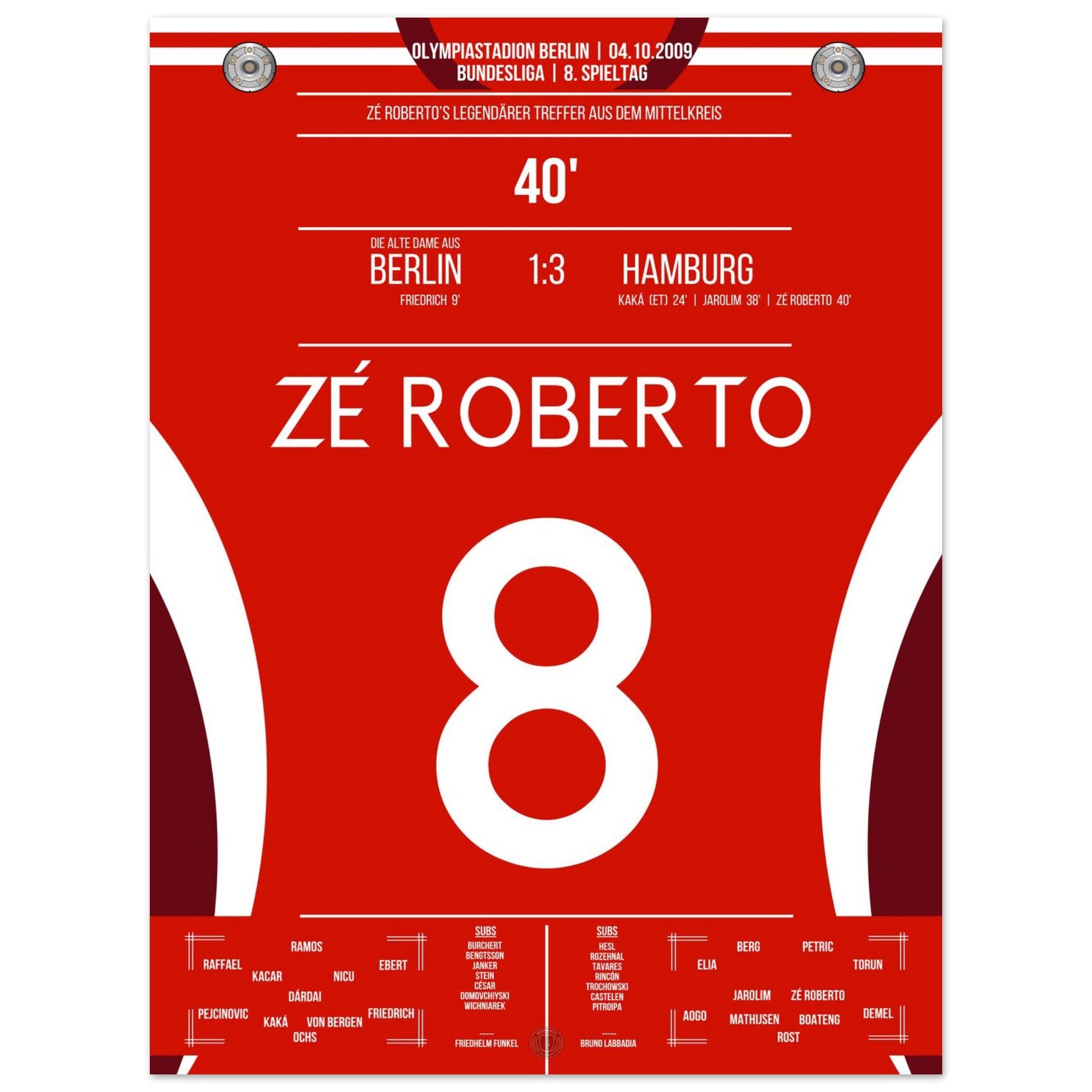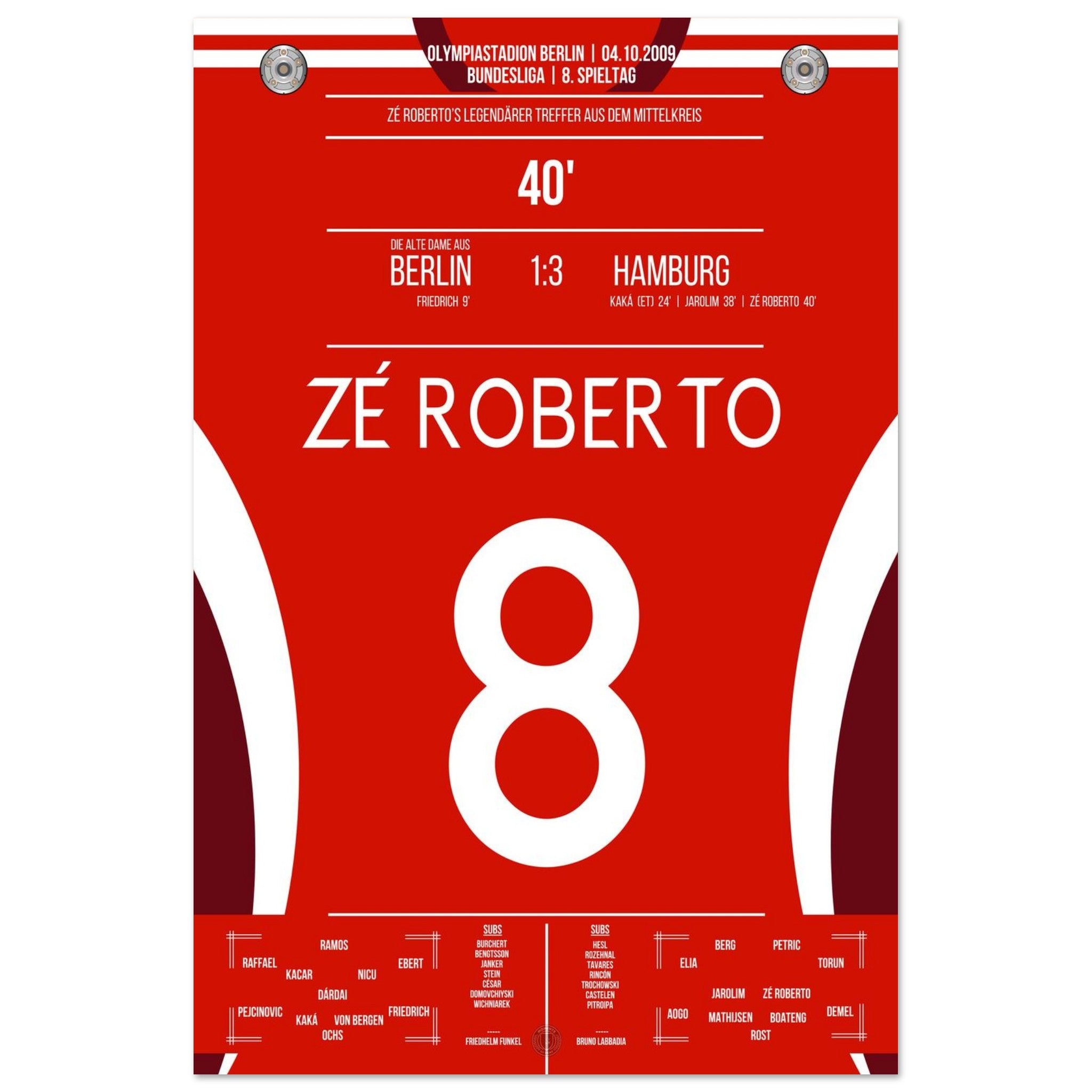 4. Oktober 2009 – Berlin vs. Hamburg 1:3: Zé Roberto krönt eine bärenstarke hamburger Leistung im Olympiastadion mit einem Traumtor aus der Distanz. Der Brasilianer verleiht dem Auswärtssieg Stil – unser Poster bringt diesen Moment zurück in dein Wohnzimmer.